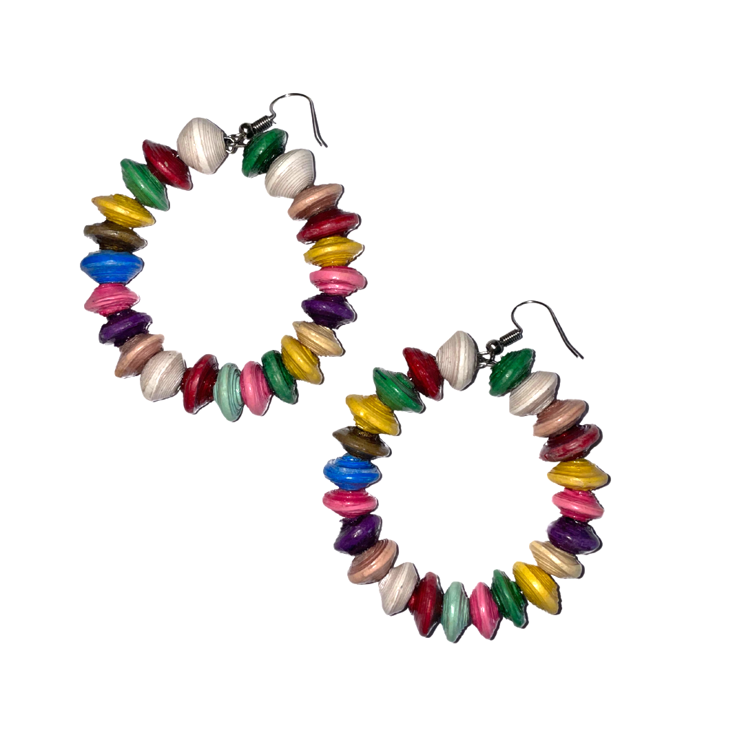 These gorgeous paper bead hoop earrings brighten up any outfit. Each bead is hand-rolled with recycled paper by Fair Trade artisans in Uganda, Africa, providing income and support for makers and their families. Each pair of earrings a piece of art.